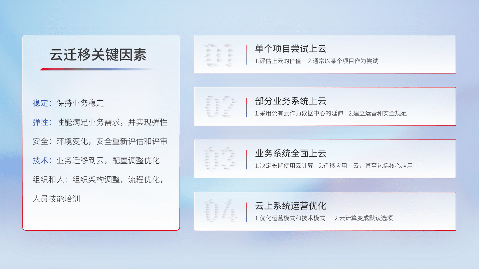 结合实际业务,,从规划设计、、、、云平台选型、、、云原生改造、、数据迁移、、、、集成交付,,迁移全过程为客户识别最佳上云路径,,,做好风险识别管理,,,设计网络架构、、身份权限、、安全审计合规、、、、操作审计、、、、日志审计、、、监控告警策略、、多站点容灾设计等,,,对云上基础设施进行整体规划,,,提升IT治理水平,,,以满足弹性、、、、高可用、、高性能的需求。。。